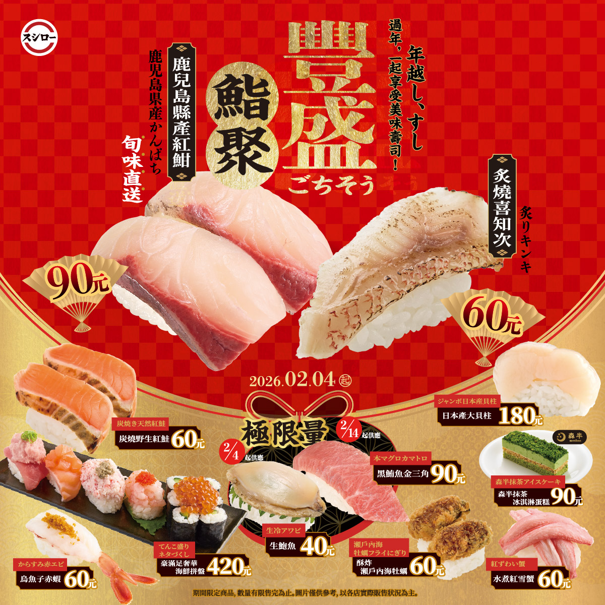 #壽司郎 #豐盛鮨聚 搶先預告🍣✨ 📅2/4(三)~ 2/22(日)期間限定登場! 👉 新春就是要吃得豐盛,這一桌先記起來!📌 🔥\ 極限量美味限定販售 /🔥 生鮑魚 (2/4起~) 黑鮪魚金三角 (2/14起~) 🍽️\ 美味接力上桌 / 🍽️ 豪滿足奢華海鮮拼盤 日本產大貝柱 鹿兒島縣產紅魽 炙燒喜知次 炭燒野生紅鮭 鮭魚泥軍艦 酥炸瀨戶內海牡蠣 水煮紅雪蟹 烏魚子赤蝦 🍰 \ 人氣聯名甜點 / 森半抹茶冰淇淋蛋糕 #郎客緊來! #數量有限售完為止 |全台壽司郎店舖| 店舖一覽,歡迎APP預約 https://www.sushiro.com.tw/Shop 壽司郎專屬訂位APP 👉$350一點,集點換好禮! IOS ➤ https://lihi1.com/1nBdp Android➤ https://lihi1.com/3rXKd
