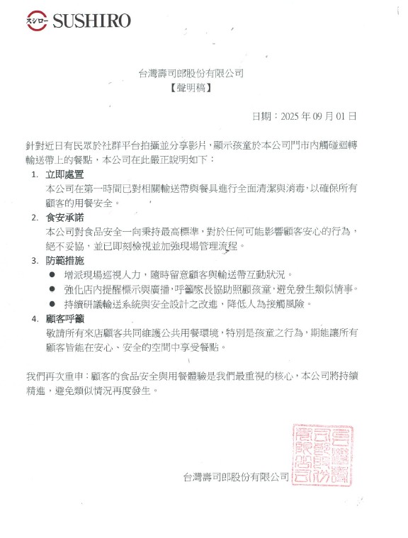 【台灣壽司郎聲明稿】 近日有網友拍攝影片,顯示有顧客於店內觸碰迴轉輸送帶上的餐點。 針對此情況,我們已在第一時間完成輸送帶與餐具的全面清潔消毒,並已加強現場巡視與提醒顧客,避免類似事件發生。 台灣壽司郎始終將「安心&安全」放在第一順位。 我們誠摯呼籲所有顧客: 1.若於用餐過程中發現任何異常,請立即通知現場人員。 2.請一同守護乾淨、安全的用餐環境。 感謝大家的支持與理解,我們將持續精進,讓每一位顧客都能放心享受美味的壽司。 若有任何最新消息,請以台灣壽司郎官方網站及Facebook粉絲專頁公告為準。 台灣壽司郎 2025年9月1日