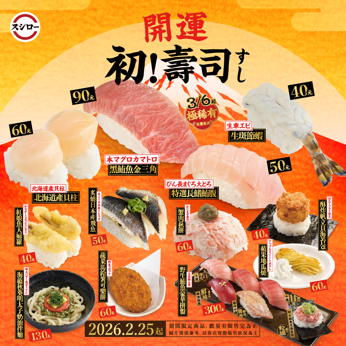 #壽司郎 #開運初壽司 搶先預告🍣✨ 📅2/25(三)~ 3/15(日)期間限定 🎊 \ 開運第一彈・超強勢美味 / 🎊 👉 野生鮪魚豪華拼盤 👉 北海道產貝柱 👉 紅娘魚天婦羅 👉 炙燒日本產飛魚 👉 蟹肉萩餅 👉 酥炸帆立貝海苔包 👉 特選長鰭鮪腹 👉 是拉差泰式辣醬鮪魚泥軍艦 👉 生斑節蝦 👉 宮崎縣產菱鰭烏賊 👉 蔬菜馬鈴薯可樂餅 👉 海蘊秋葵明太子奶油拌麵 ✨期間限定甜點 🍠蘋果地瓜燒 🍎 🔥\ 極稀有 超級限定登場 /🔥 黑鮪魚金三角 (3/6起~售完為止) #郎客緊來 #數量有限售完為止 |全台壽司郎店舖| 店舖一覽,歡迎APP預約 https://www.sushiro.com.tw/Shop 壽司郎專屬訂位APP 👉$350一點,集點換好禮! IOS ➤ https://lihi1.com/1nBdp Android➤ https://lihi1.com/3rXKd